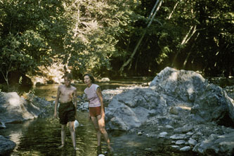 We often went to my Grandmother Maymay's summer house near Inverness on Tomales Bay, north of San Francisco, where there were indian middens, trails through the forest with an indian chief's stone throne, a boathouse and dock, and a private beach with a stream running down it that we could dam up and divert (until the next high tide).