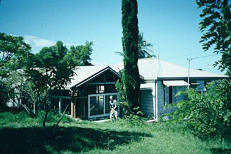 We built a home on a mountainside in Mont-Dore in 1976. It had seven sides to fit on the one solid outcrop on our sloping lot, with the bedrooms downstairs and an open upstairs living room, dining area and kitchen alcove, with a fireplace/chimney in the middle and a large balcony with a view of the bay and the peninsula with the city of Noumea on the far side. The beamed ceiling rose up to the central chimney, with ventilation to keep the house cool. It was a wonderful place for Bahá'í events, including a meeting with Ruhiyyih Khanum.
