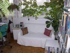 I have lived in three different small apartments since moving to Geneva in 1992, with the most recent and smallest just 29 square meters, but always only a short walk from my office. I picked the locations to be close to my work and avoid excess transport. The challenge is to fit a maximum of books into the available space why keeping it functional and aesthetically pleasing. Dividing my residence in two has helped. When I decided to stay in Geneva on retirement, I bought a small chalet in a forest 40 minutes from Geneva in Haute Savoie, France, in 2000 (see the chalet page for pictures). While there is more space in my chalet in the forest (35 square meters), it is equally crowded. Most of the books in my apartment are on the Bahá'í Faith, with some on economics and sustainability for the courses I teach. Other collections of books on literature, history, science, art and nature are at the chalet, as are my special collections on islands and coral reefs. The paintings are almost all by Bahá'í friends of mine.