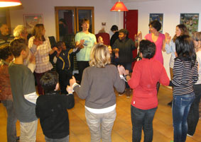 About 60 people of all ages from France, Belgium, Luxembourg and Switzerland gathered the last week of February at the Chalet Olinga in La Chapelle d'Abondance, a ski resort in the French Alps behind Thonon-les Bains, for a week of classes, artistic activities and winter sports. With mostly sunny weather and almost a meter of snow, conditions were perfect to exercise our minds, souls and bodies. I gave two lectures on principles of governance from the Baha'i writings, as well as a children's class on governance, and took part in a musical workshop where, for the first time, I learned how to sing in a choir while we composed new songs setting Hidden Words of Baha'u'llah to music. It was a very uplifting week. For the scenery and my afternoon treks on snowshoes, see my travel page.