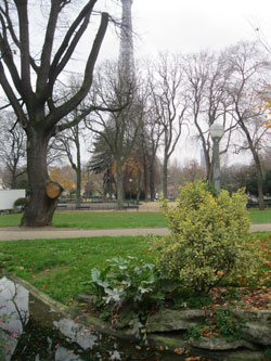 Eiffel Tower across from the Trocadero Gardens; walking in the gardens; a tree blooming in December