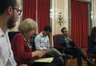 The day ended with a workshop on the Dialogue process led by Marco Boccaletti, Merle Lefkoff and Vern Redekop. The principles of dialogue include becoming aware of what is happening inside of you, especially strong feelings, being respectful of time and giving everyone time to speak. It is important to be able to listen, not interrupting and giving everyone equal time. Dialogue can be used in real negotiation processes, building trust so that the truth can come out. In thinking creatively together, try to build on each other’s contributions and come up with shared action areas.