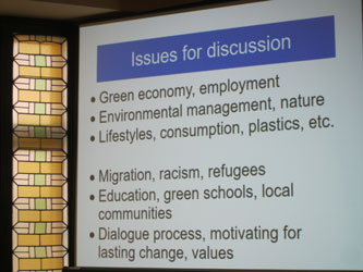 The Wrap-up Session on Sunday 27 October was moderated by the Chair of the Youth Forum, Arthur Lyon Dahl. He invited all the participants to suggest the topics they wanted to discuss. These were combined into six common themes, and everyone was invited to join small group discussions on the themes that most interested them. A first round discussed a Green Economy, Ecosystems and Environmental Management, and Lifestyles, while the second round explored Racism and Migration, Education, and Dialogue processes and inspiration to change.