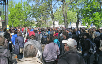 crowd of all ages gathered in the Jardin Anglais park along the Geneva