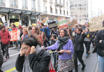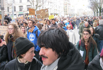 On Friday 15 March 2019, 16 year-old Greta Thunburg of Sweden called for a global strike by children and youth to march in the streets to demand action now on climate change to protect the interests of her and future generations. Millions turned out all over the world. There were 40,000 in Paris, 10,000 in Lausanne and over 5,000 in Geneva. In Geneva the youth invited everyone to join them in support, so I marched with a sign "veillards pour les jeunes" (old people for the youth). The march started near the train station, crossed the Pont du Mont-Blanc between the two halves of the city, went along a main shopping street and through the banking sector (where the youth shouted protests at the banks for their fossil fuel investments), and on to the main square with the opera house and university. The following is a photo album along the march.