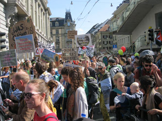 After local student climate strikes and marches on Friday, there was a national climate march in the capital, Bern, on Saturday 28 September. I went by train, and even with 14 extra trains put on from all over Switzerland, there were still people standing in the aisles and sitting on the stairs going and returning. 1,000 came by bicycle along 30 predefined routes from different parts of the country.
