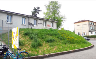 I walk to the shopping centre (15 minutes), I go through Balexert Park, a small park which has some old trees, a community centre (below right), a youth centre, a recreation centre for children (Jardin Robinson) with animals (goats, rabbits) and demonstration vegetable garden, and a playground with an intermittent fountain area for children to play in.