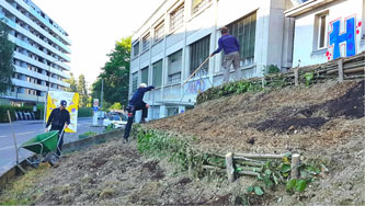 In November 2021, I participated in the initiation of an urban micro-forest across the street from the Parc des Franchises near where I live. One of two experiments in the city, it is alongside the old industrial zone of Charmilles, while the other is on the Butte Ferdinand-Hodler. They follow the Miyawaki method that imitates a primary forest by densely planting a wide variety of indigenous species, with 800 young trees and shrubs planted along the slope between the factory buildings and the street. These micro-forests are expected to counteract the heat-island effect, clean the air, absorb rainwater, and improve the neighbourhood quality of life, while enriching local biodiversity. This is part of the city government's plan for an ecological transition.