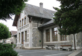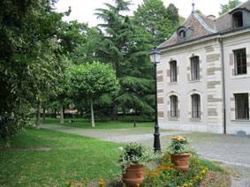 A five-minute walk towards Geneva takes me to a wonderful large park mostly hidden behind houses and buildings. It used to be the horticultural school founded in 1887 (right), so it has retained extensive rose gardens with many varieties, an arboretum of unusual conifers, a half-abandoned grotto with waterfalls and pools, large grassy areas, children's play areas, a large wading pool with fountain, facilities for skateboarders, a separate garden for walking dogs, and a hidden natural wetland fenced from public access. It is a lovely place to sit and read, or take a sun bath.