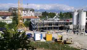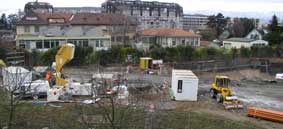 My apartment faces west, towards a small factory making parts for Rolex watches, with some of the Jura mountains visible between the buildings. However most of the view has now vanished (see below) as a 7-storey building was built across the parking lot in 2008-2010. An extension of this building is being built in 2019-2020, blocking most of the rest of my view. The pictures of the construction below were taken from my apartment window.