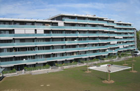 My tiny (29 square meter) studio apartment is in a small square building built in the 1960s, that was 5 stories, but was recently increased to seven, one of four similar buildings set well back from any roads with traffic, and with grass all around. It is a very quiet neighbourhood by urban standards.